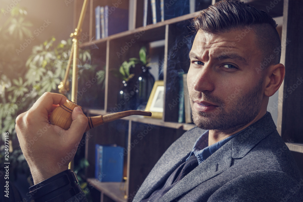 Young Fashionable Rich Man With Bristle And Stylish Hairdo Sits In