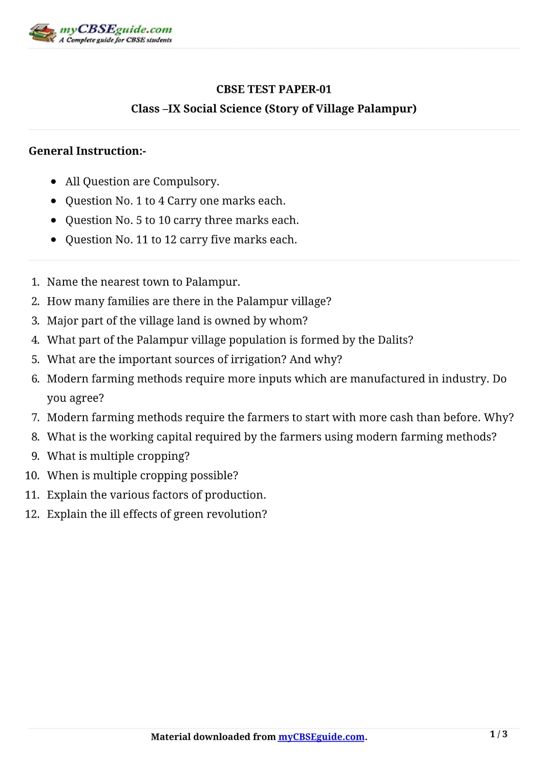 The Story Of Village Palampur 9th Economics Chapter 1 Sample