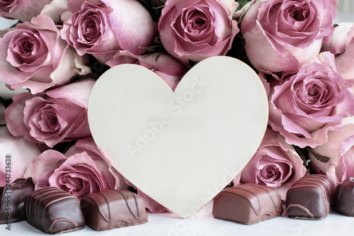 Beautiful Retro Soft Pink Rose Flower Background With Wooden Heart