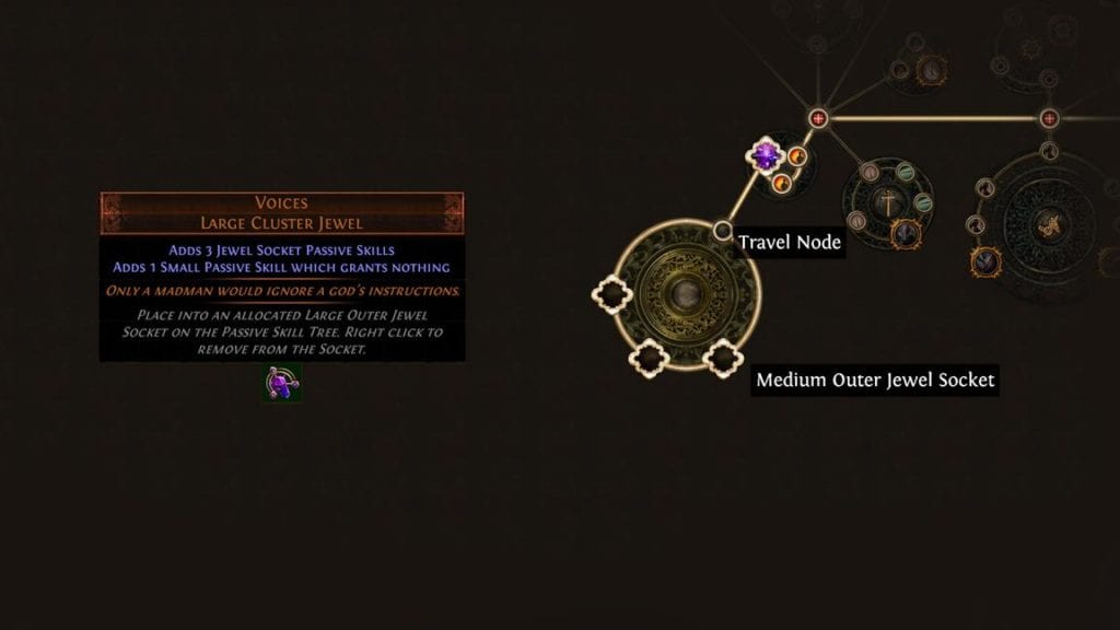 Voices Large Cluster Jewel Adds 3 Jewel Socket Passive Skills (Added Passive Skills are never considered to be in Radius by other Jewels) Adds 7 Small Passive Skills which grant nothing (Added Passive Skills are never considered to be in Radius by other Jewels) 「Simulacrum」Limited Drop 「Delirium」League Specific:. 17 passive points required for all this (3 point rampup, 9 points in large jewel, 4 points in medium, 3 in small jewel).. Place into an allocated Jewel Socket on the Passive Skill Tree..