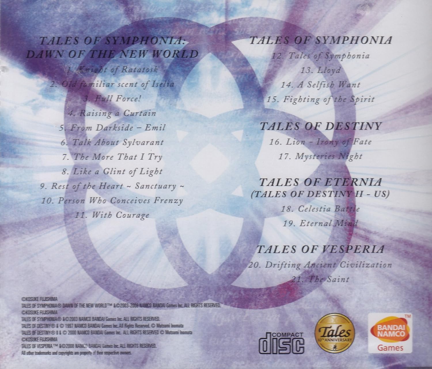 03 Lion-Irony of fate- 4:41 04 Mysteries Night 3:50 05 Silent Night + Endless Dream 3:43 06 CELESTIA BATTLE 3:42 07 ETERNAL MIND 4:05 08 Dona nobis pacem 2:58 09 Wheel of fortune 3:48 10 The decision to the future -Mist 3:50 11 Eternal oath 3:47 12 Last battle -decision- 4:11 13 Icy edge 3:24 14 Guidance of the moon 3:03 15 Wing of hope 3:46. The song is played in Tales of Destiny whenever the party fights Leon.. <Yanama> So, You just roleplay?.
