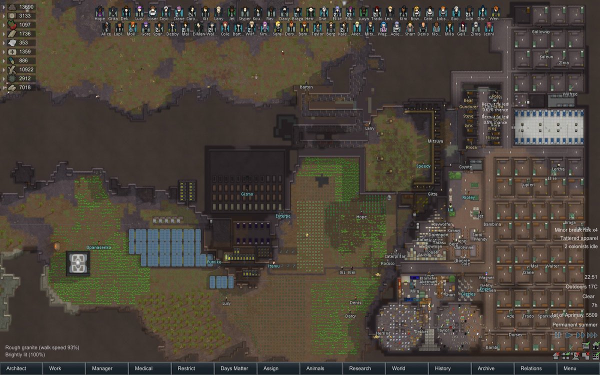 8 Years In After Going From 1 To 18 Then 18 To 3 And Back Up To 22 Colonists Randy Med Rimworld