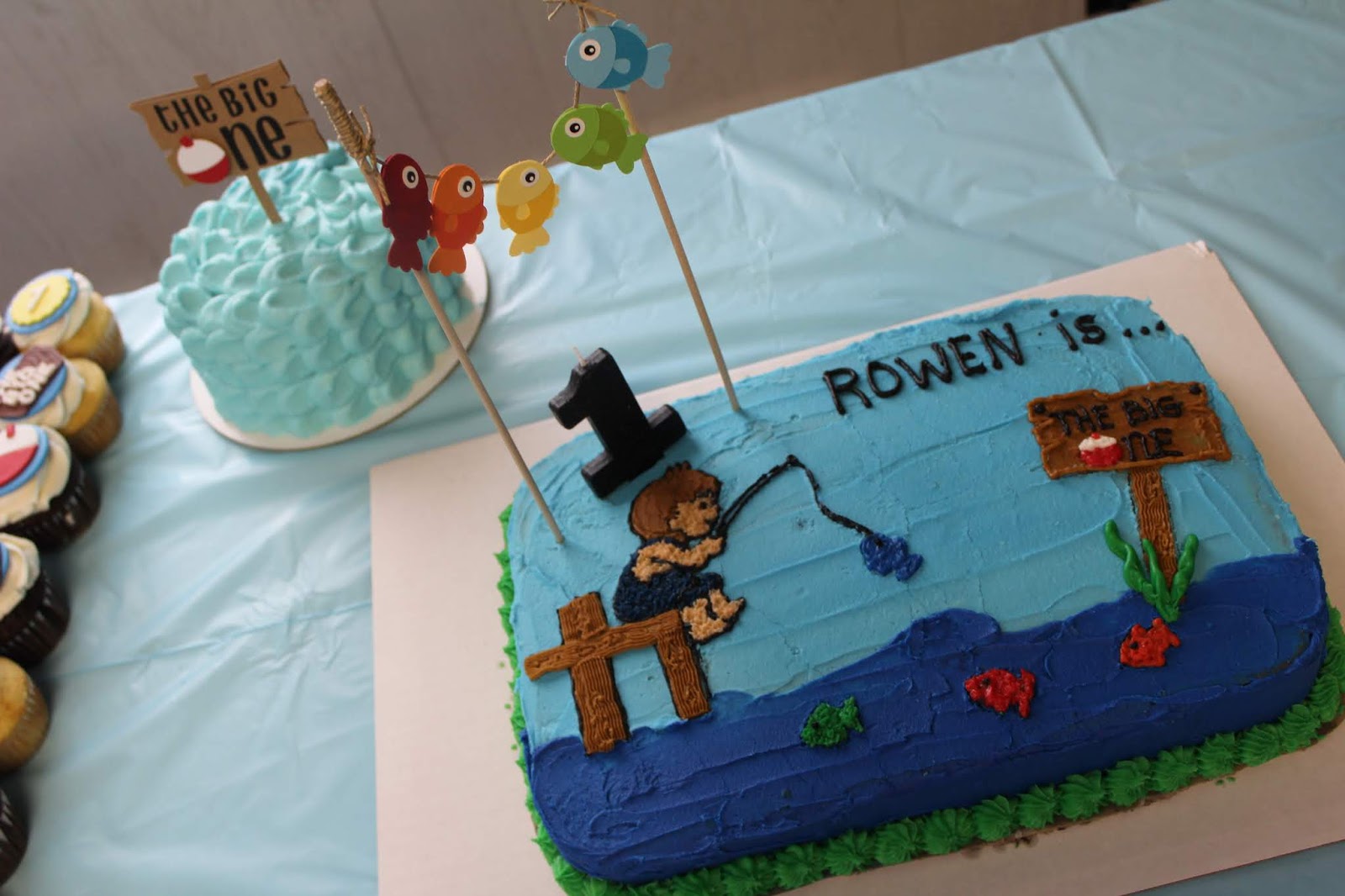 The Big One Fishing Birthday Cake And Cupcakes By 3 Sweet Girls Cakery Fishing Themed Birthday Party Childrens Birthday Cakes Fishing Birthday Party