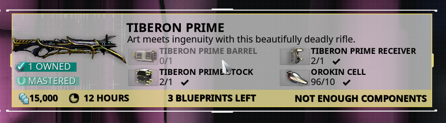 Specifically Frost Prime, Latron Prime, and Reaper Prime.. So in my inventory ( prime parts ) i can't see the tiberon's parts .. 1) Tiberon wraith won't happen.Wraith are grinieer, tiberon is tenno weapon afaik..